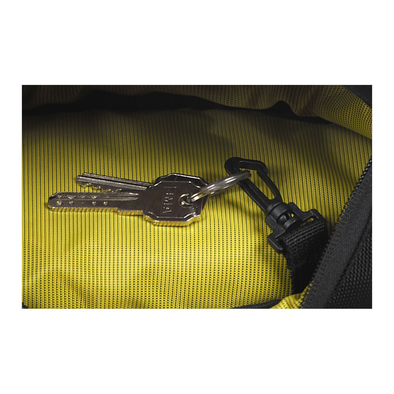 - Hauptfach mit Netztasche mit Reißverschluss und Haken für Karabiner für Schlüssel.