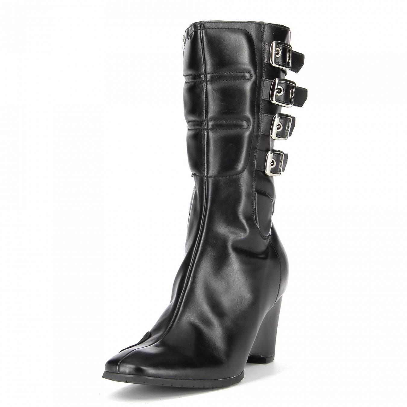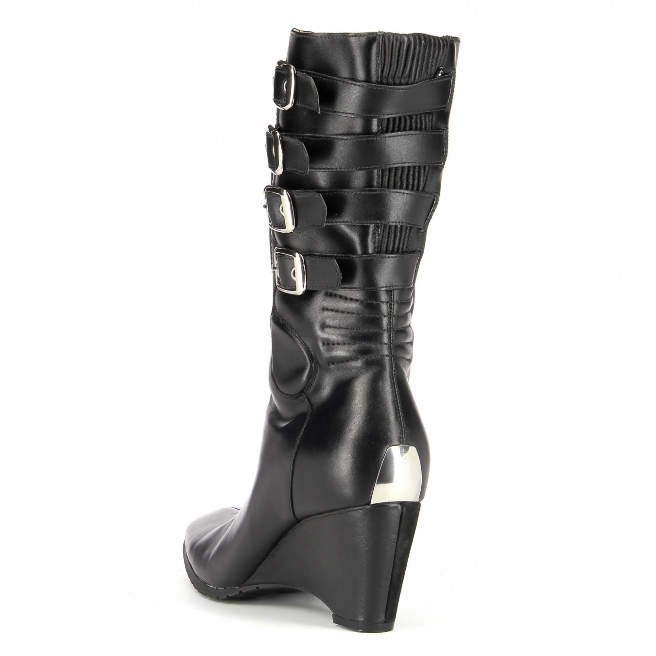 Hochwertiges Leder schützt die Füße vor Abschürfungen, während der Knöchel und die gepolsterte Innensohle für ein angenehmes Fahrgefühl sorgen. Die Absätze sind Metallplatten, die funktional erscheinen, aber es gibt vor allem einen Spritzer glänzendes Metall, um das (wie das Symbol es nennt) Menage-a-Quad-Schnallen-Design zu vervollständigen. Für die allgemeine Passform gibt es gerippte Wadenaufweitungseinsätze und ein Reißverschlusssystem