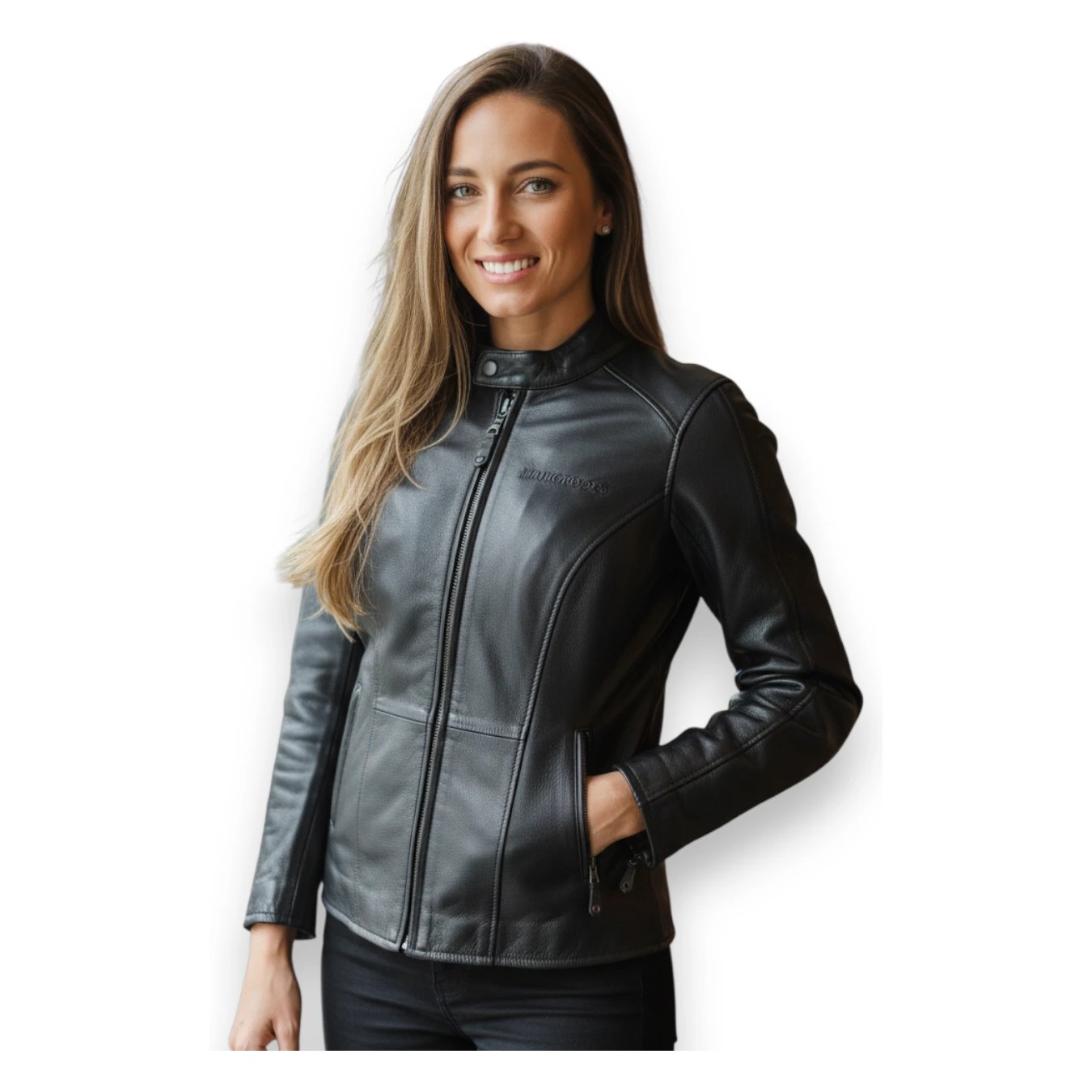Lederjacke für Damen, an der Taille verschraubt, Schulter- und Ellbogenschutz, ideal für alle Frauen, die ein Lederkleidungsstück suchen, das nicht zu sportlich ist.