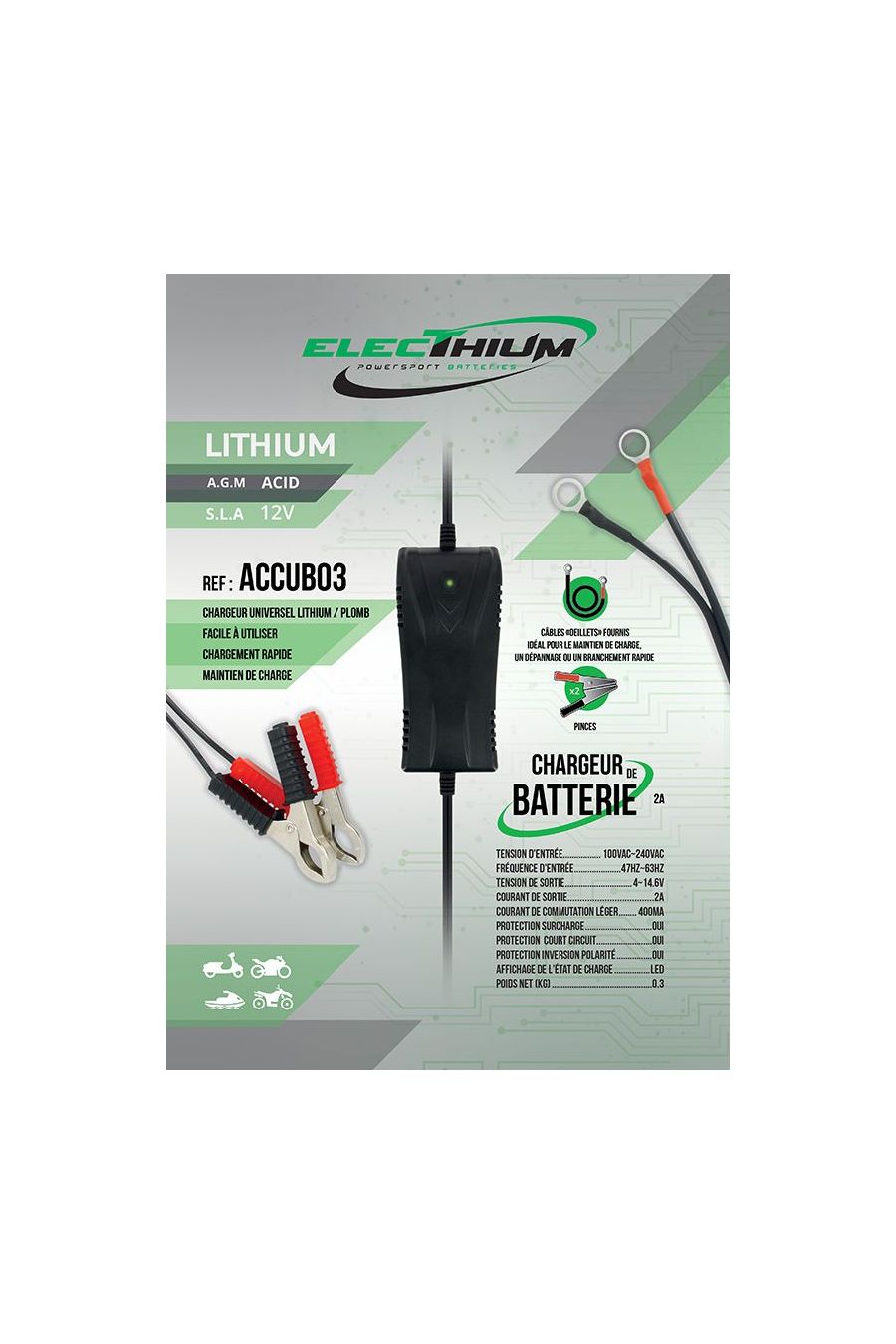 Um die gesamte Leistung der Lithiumbatterie zu erhalten, muss sie mit einem speziellen Ladegerät aufgeladen werden.Das Batterieladegerät ACCUB03 wurde speziell entwickelt, um die Leistung und Langlebigkeit der Lithium-, AGM- und Acidium-Batterie zu verbessern
