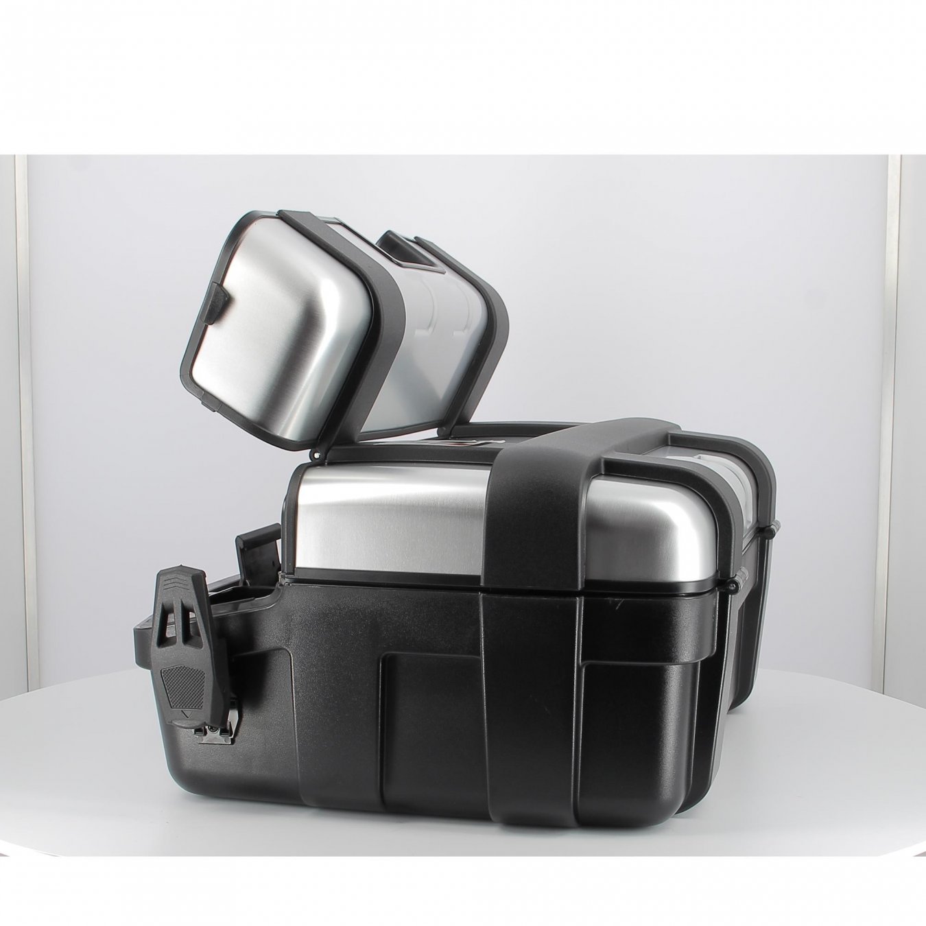 Dank dei Selektoren im Inneren der Koffer kann bei beiden Versionen entschieden werden, ob der gesamte Deckel oder nur die obere Tür geöffnet werden soll (sehr praktisch, um während der Fahrt Gegenstände in den Koffer einzuführen oder zu entfernen, ohne dass das gesamte Gepäck umgeworfen wird).
