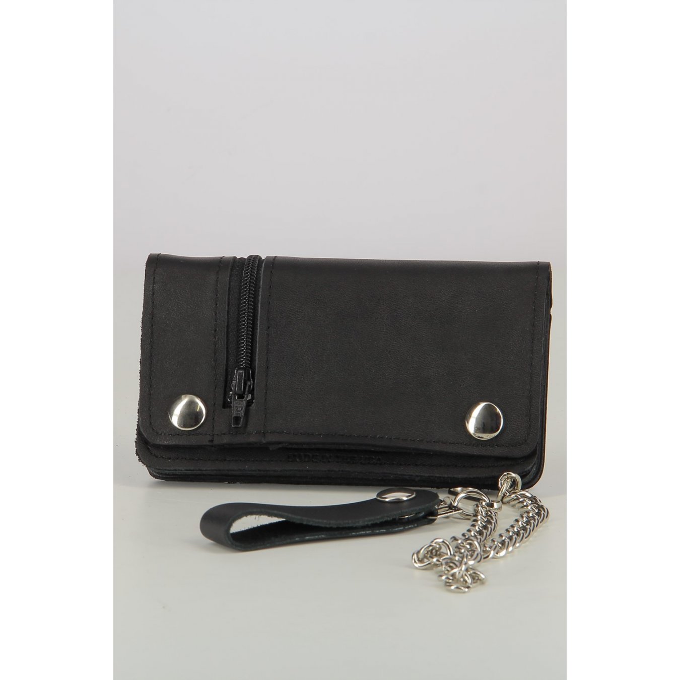 Genuine leather motorcycle wallet. Side zip. Chain with belt ring. Dimensions 6'' x 3 3/4- Brand
