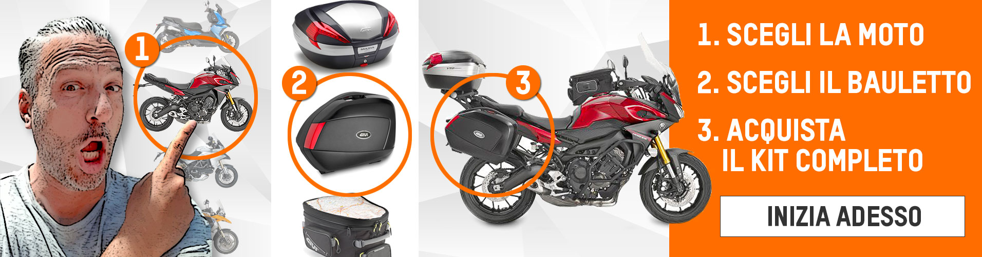We have a WORLD EXCLUSIVE AUTOMATIC CONFIGURATOR to install the top case on your motorcycle, in a few clicks you can find the right solution for your bike. What are you waiting for, try it now.