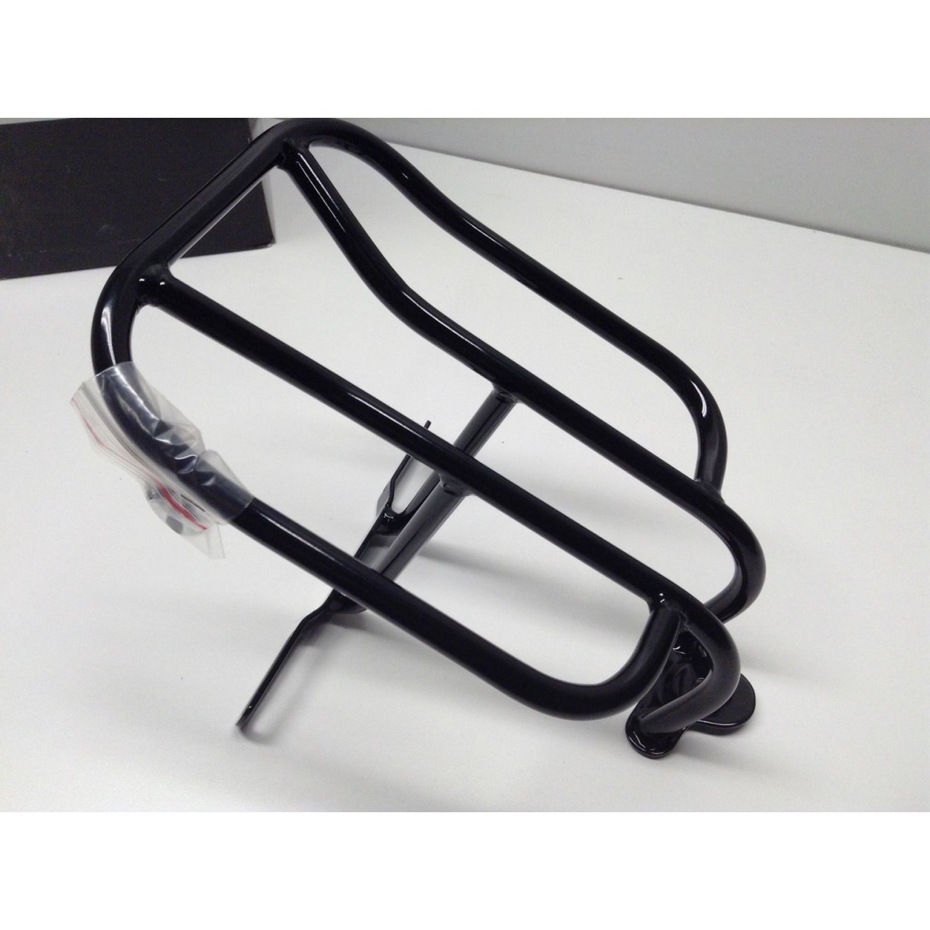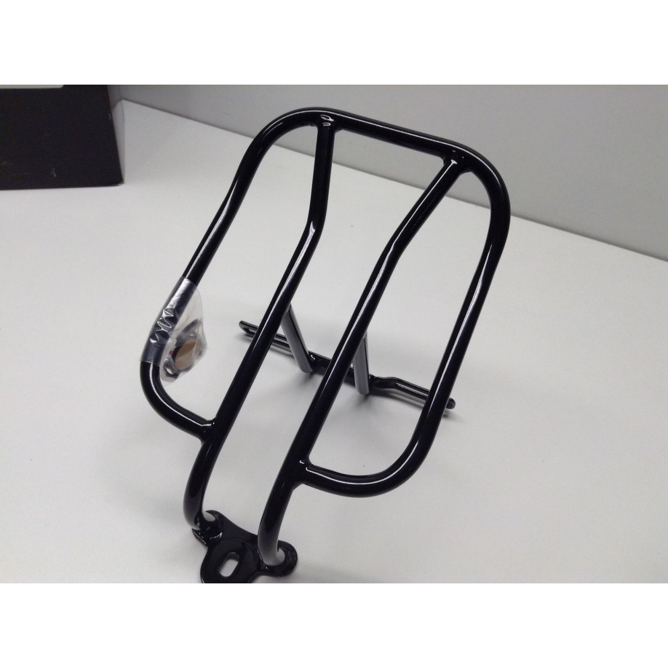 Glossy black powder rack made of 9.5mm (3/8) steel tubao, carries up to 4.5kg (£10)It is mounted using the saddle screw and the plate bracket