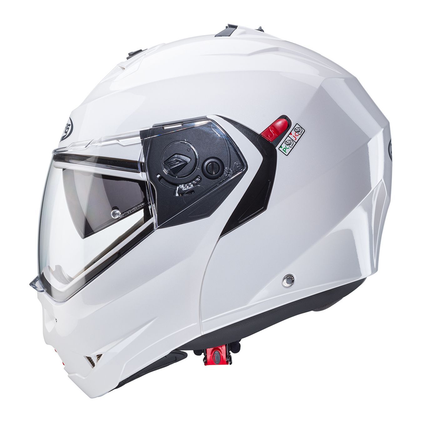 Frutto dell’esperienza maturata dalla prima azienda italiana ad aver prodotto caschi apribili, DUKE X è dotato della doppia omologazione P/J che permette di guidare anche a mentoniera alzata sempre in sicurezza grazie al selettore posizionato sulla sinistra del casco che blocca la mentoniera nella posizione di massima apertura nella posizione J, evitando così la chiusura accidentale della stessa. Grazie alle ridotte dimensioni del casco, il peso del DUKE X è di solo 1550 +-50 gr.