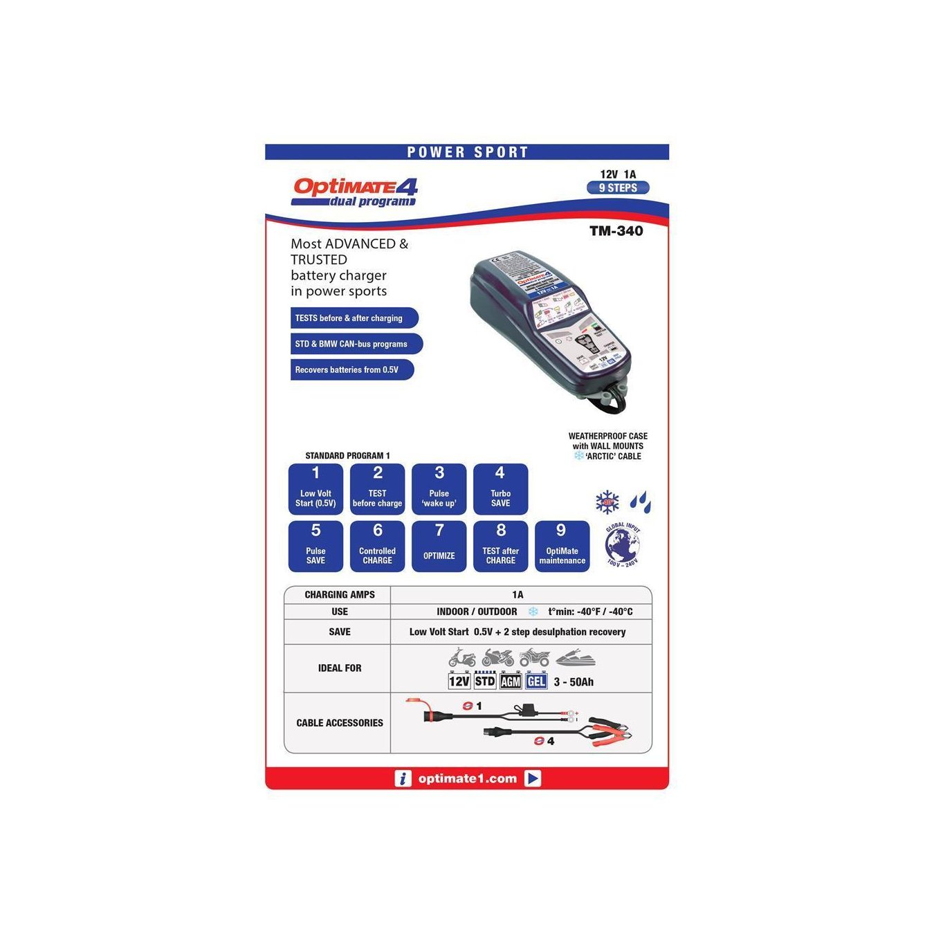 OptiMateTM4, la exclusiva herramienta todo en uno para mantener las baterías de 12 V en casa, ahora está disponible con DUAL PROGRAM, que realiza diagnósticos, recuperación, carga, pruebas y mantenimiento automático óptimos. Con conexión directa, o seleccionando el programa para cargar a través del enchufe de 12V en motocicletas equipadas con CAN-bus.Activación SIN TOCAR LA TECLA: OptiMate 4 DUAL PROGRAM carga y mantiene la batería automáticamente hasta que se desconecta. OptiMate 4 DUAL PROGRAM incluye el modo de recuperación de pulsos de bajo voltaje para una recuperación aún más eficiente de las baterías descuidadas, una prueba de batería fácil de usar en la conexión, una elegante carcasa resistente a la intemperie con asas de montaje integradas y una eficiencia energética mejorada. Al extender la duración de la batería al 400%, OptiMate 4 DUAL PROGRAM mantiene la batería segura y lista para usar durante meses.