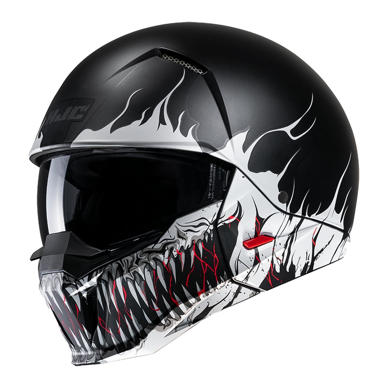 Este casco inspirado en el street fighter está equipado con una máscara extraíble y VISERAS SOLARES DE VISIÓN AMPLIA CON REVESTIMIENTO ANTIVAHO (HUMO Y CLARO) que se operan manualmente con pestañas de extracción ubicadas a cada lado del casco.