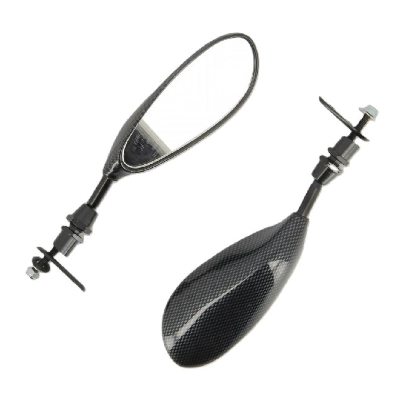 Coppia specchi finto carbonio con regolazione sferica.Universali per tutte le moto con filetto di 6 mm, da applicare sulla carenatura in uno dei due fori dove è fissato lo specchio originale.