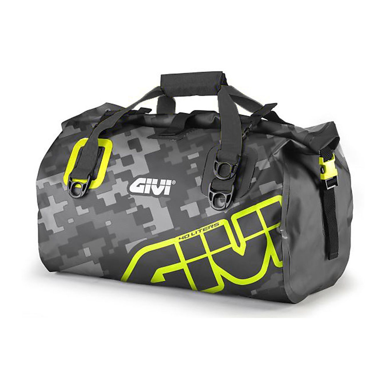 Sacoche de selle étanche 40 lt, graphisme camouflage gris et jaune.