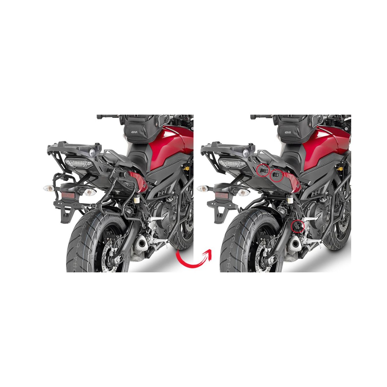 Per smontare il supporto dalla moto quando non si utilizzano le valigie laterali, sarà quindi sufficiente ruotare di mezzo giro le viti speciali (fig. 2 e 3) utilizzando una chiave personalizzata GIVI inclusa nella confezione; in pochi secondi la coda della moto risulterà completamente pulita come nella sua linea originale.