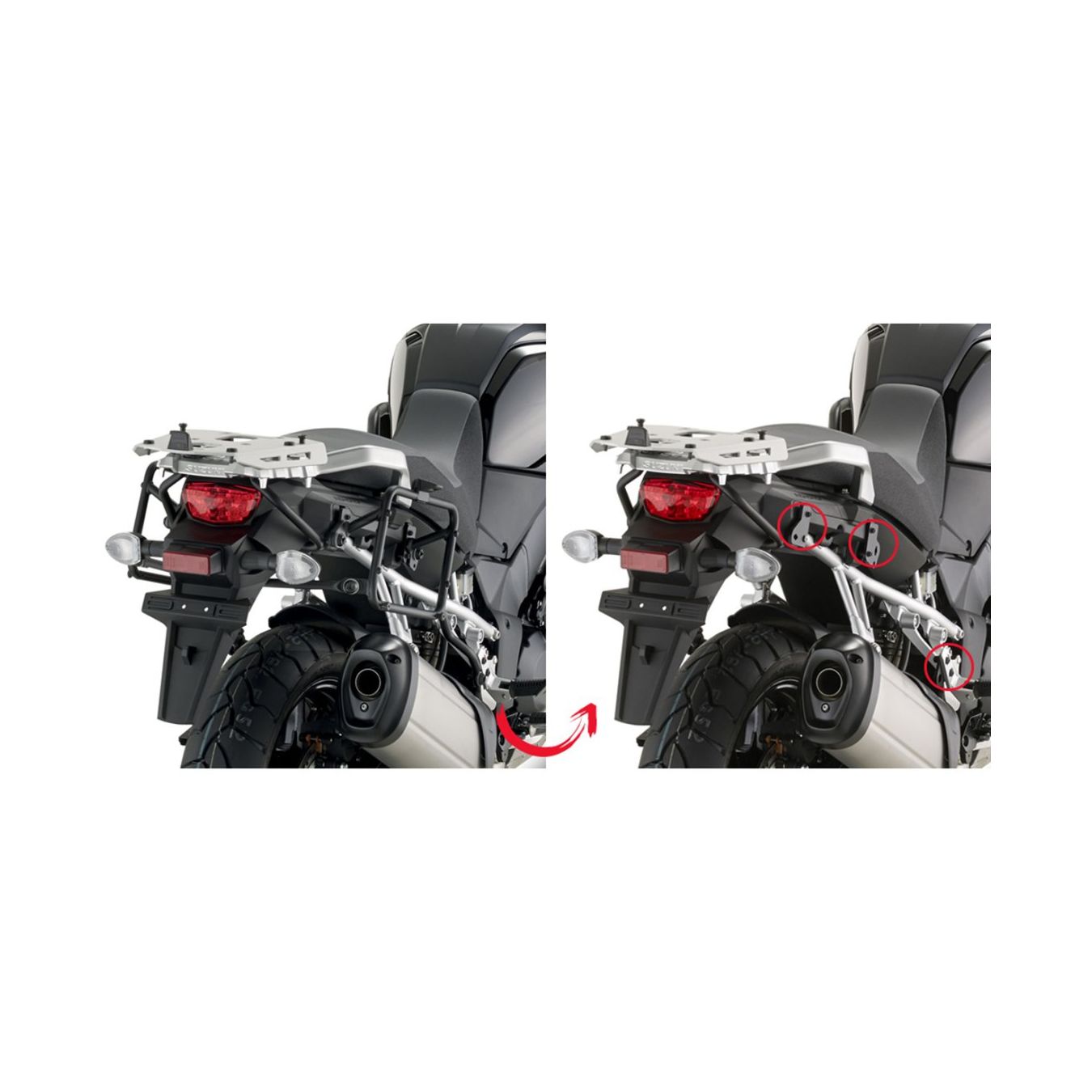Incredibilmente minimale ma assolutamente robusto e affidabile, il sistema di ancoraggio PL è costituito da un leggero telaio tubolare di colore nero progettato per sostenere due valigie laterali. Il design essenziale non disturba la linea della moto e l'assemblaggio del telaietto risulta semplice e veloce in tutte le fasi di montaggio / smontaggio.