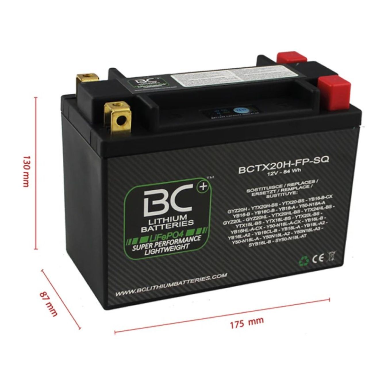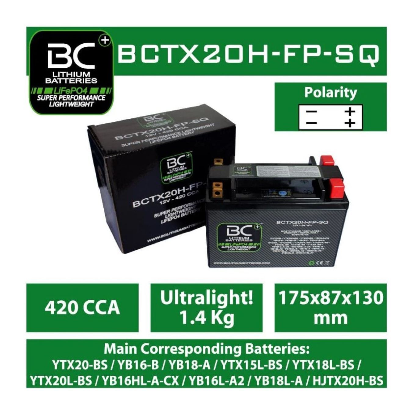 La batteria litio per moto BCTX20H-FP-SQ sostituisce le seguenti batterie al piombo-acido: GYZ20H - YTX20H-BS - YTX20-BS - YB16-B-CX - YB16-B - YB16C-B - YB18-A - Y50-N18A-A - GYZ20L - GYZ20HL - YTX20HL-BS - YTX24HL-BS - YTX15L-BS - YTX18L-BS - YTX20L-BS - YB16HL-A-CX - Y50-N18L-A-CX - YB16L-B - YB16L-A2 - YB16CL-B - YB18L-A - YB18L-A2 - Y50-N18L-A - Y50N18L-A2 - Y50N18L-A3 - SYB16L-B - SY50-N18L-AT. Codici batterie al litio corrispondenti: LTX20H-BS - LTX20H-Q - MM-ION-12 - HJTX20H-BS
