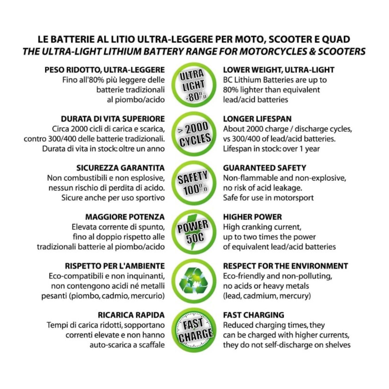 Le batterie BC Lithium sono sicure, eco-compatibili e non inquinanti: non contengono acidi né metalli pesanti (piombo, cadmio, mercurio), non sono combustibili né esplosive, non c'è rischio di perdita di acido.