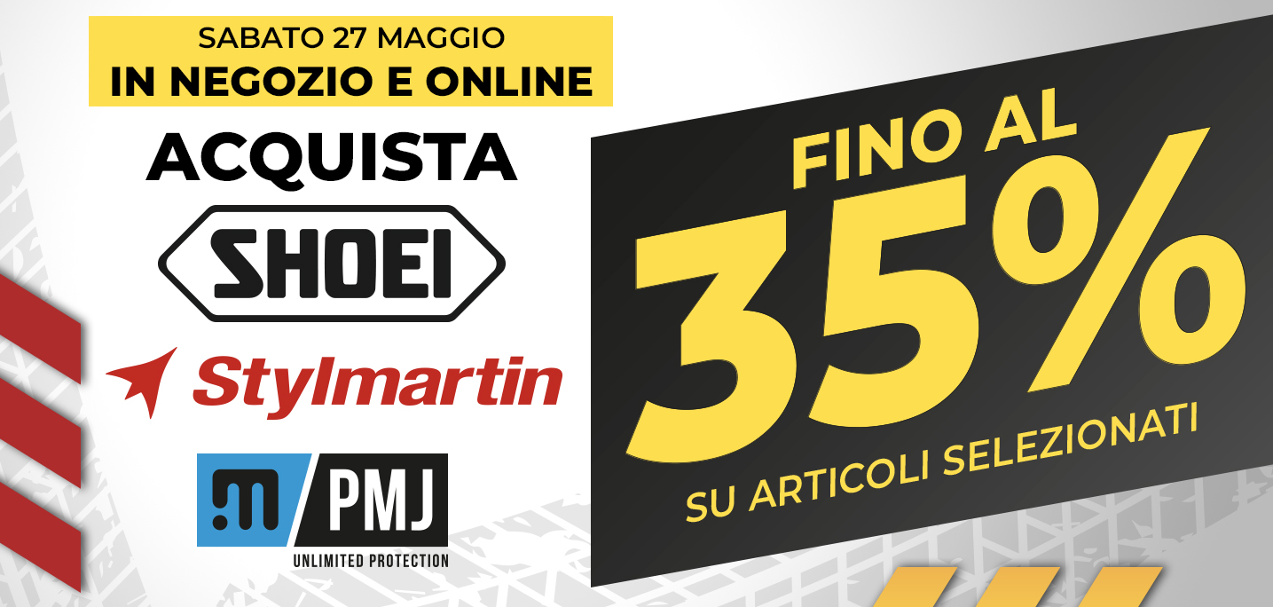 SCONTI SPECIALI: SOLO sabato 27 maggio su caschi SHOEI, scarpe STYLMARTIN e pantaloni PMJ.