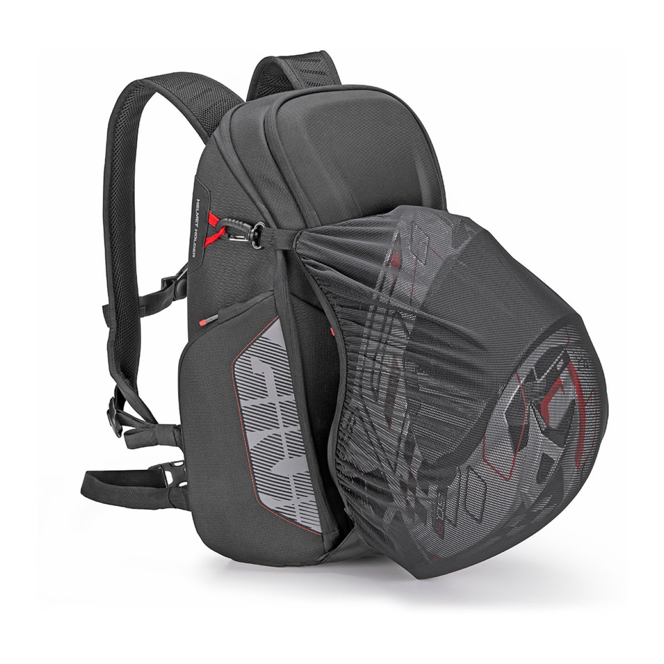 • Tasca porta casco CON RETE estraibile posizionata sul fondo, con supporto elastico da agganciare agli appositi passanti, posizionati sui lati superiori dello zaino