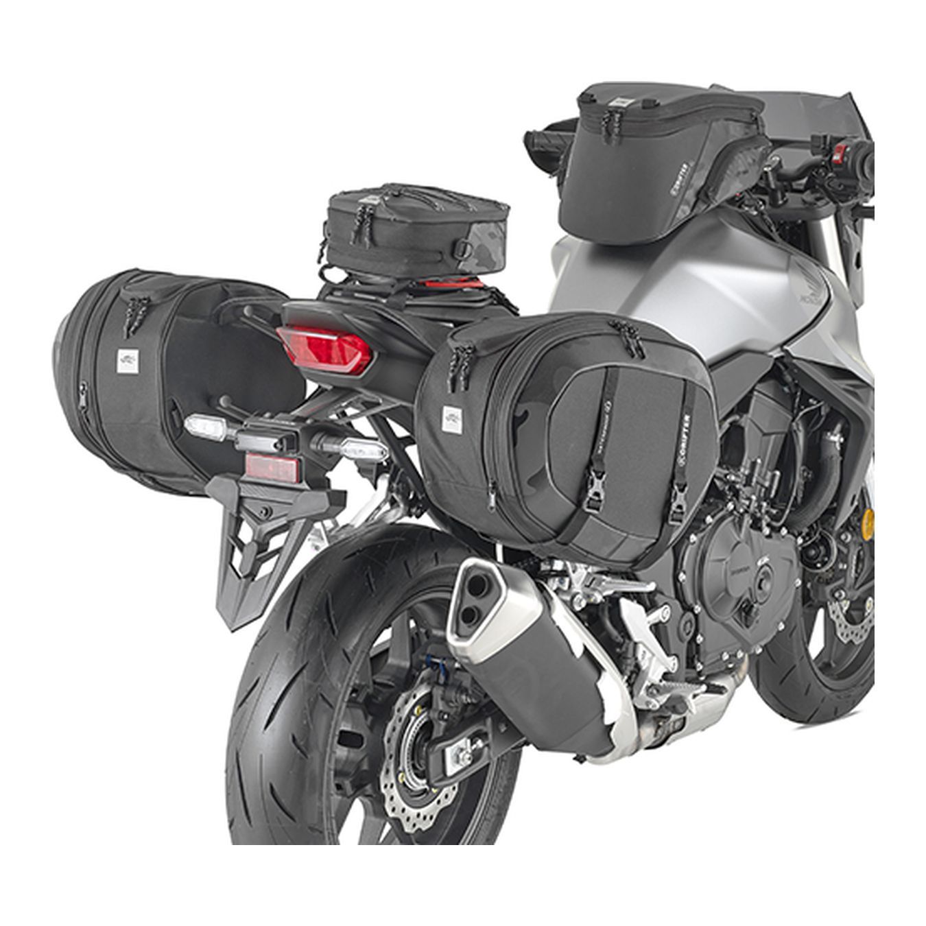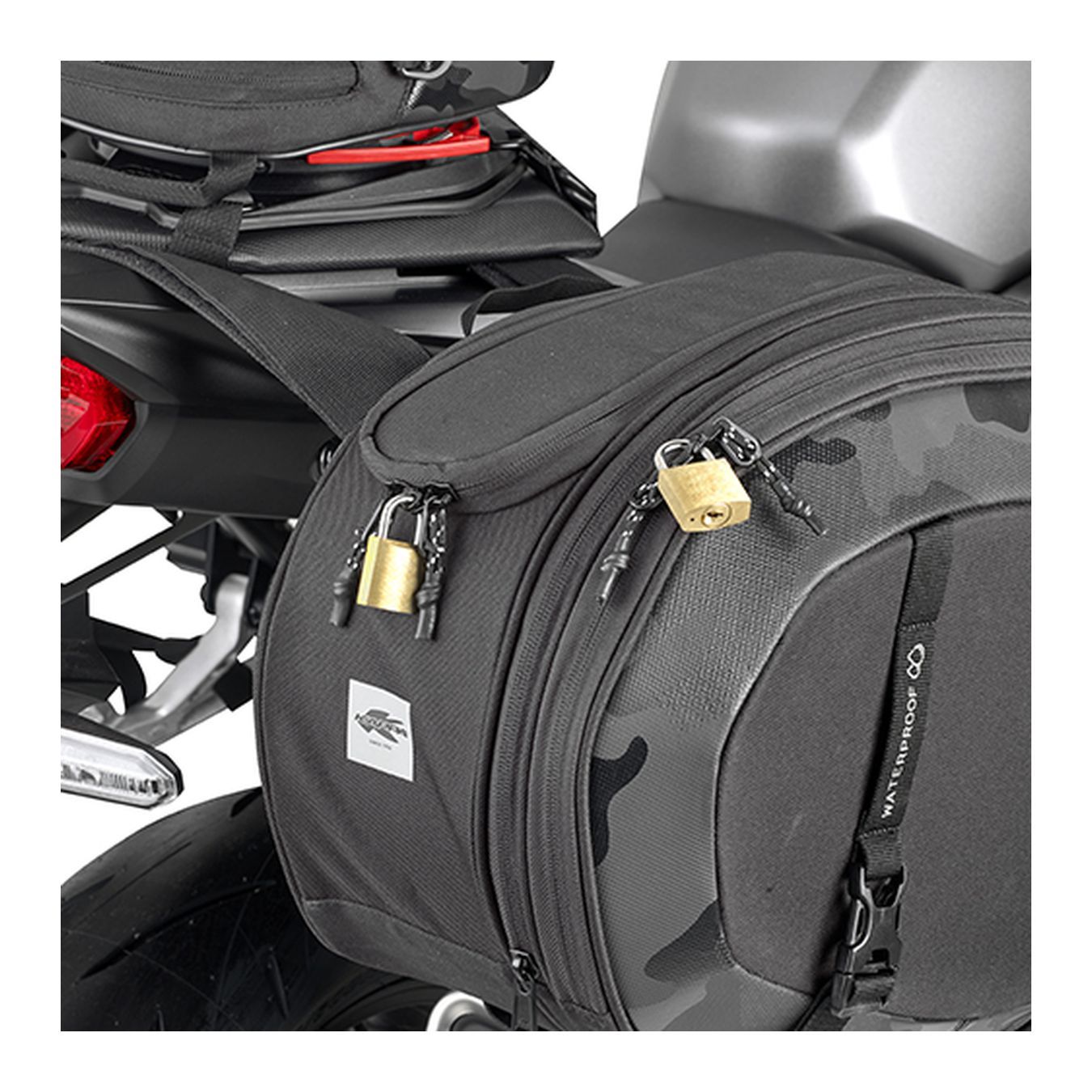 Coppia di borse laterali universali, 40 lt. che possono essere montate su qualunque moto o scooter. I telaietti non sono necessari per il montaggio delle borse, ma sono altamente consigliati sia su moto che su scooter per distanziare le borse dalla ruota e dagli scarichi