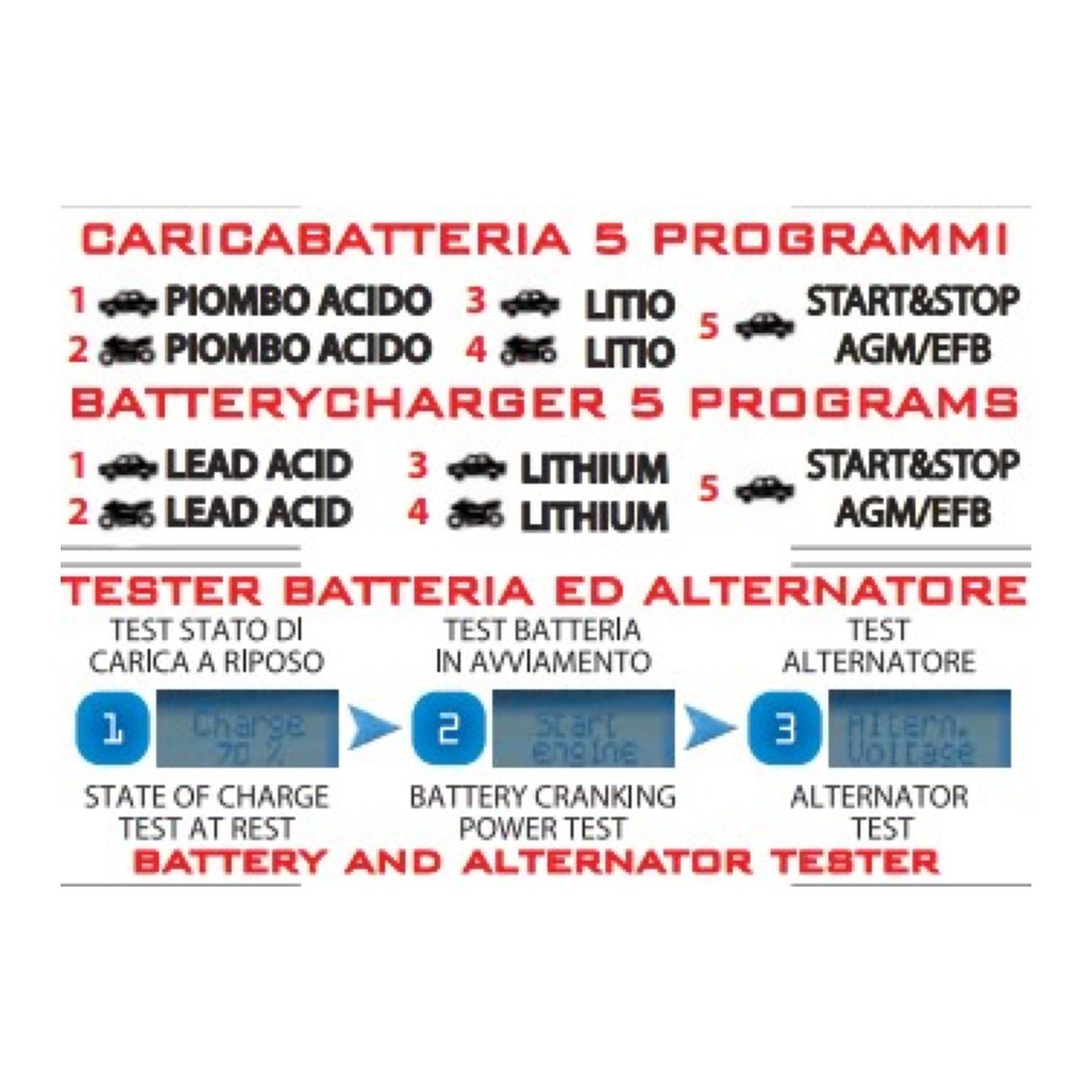 * 5 programmi: CAR per batterie auto, BIKE per batterie moto, START&STOP per batterie AGM/EFB