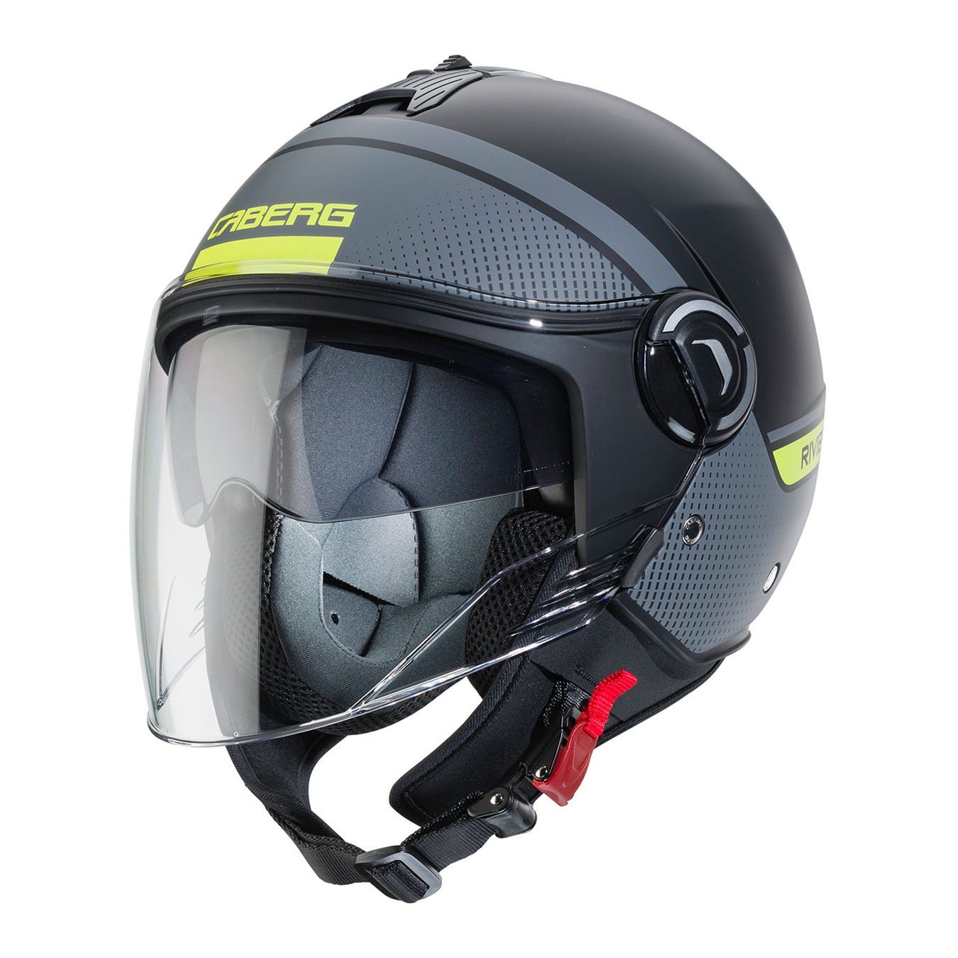 RIVIERA v4 è il nuovo demi-jet di Caberg dalle linee innovative ed eleganti pensato sia per utilizzo urbano che extraurbano. Caratterizzato da una calotta piccola, risulta essere pratico e comodo con la possibilità di essere stivato facilmente nei sottosella degli scooter. Visiera esterna con trattamento antigraffio e a sganciamento rapido. Presa d'aria superiore e due estrattori posteriori. Sistema integrato di doppia visiera. Sistema di ritenzione micrometrico. Anello d'acciaio sul cinturino per assicurare il casco alla motocicletta. Interni completamente estraibili e lavabili in tessuto ad alta traspirabilità