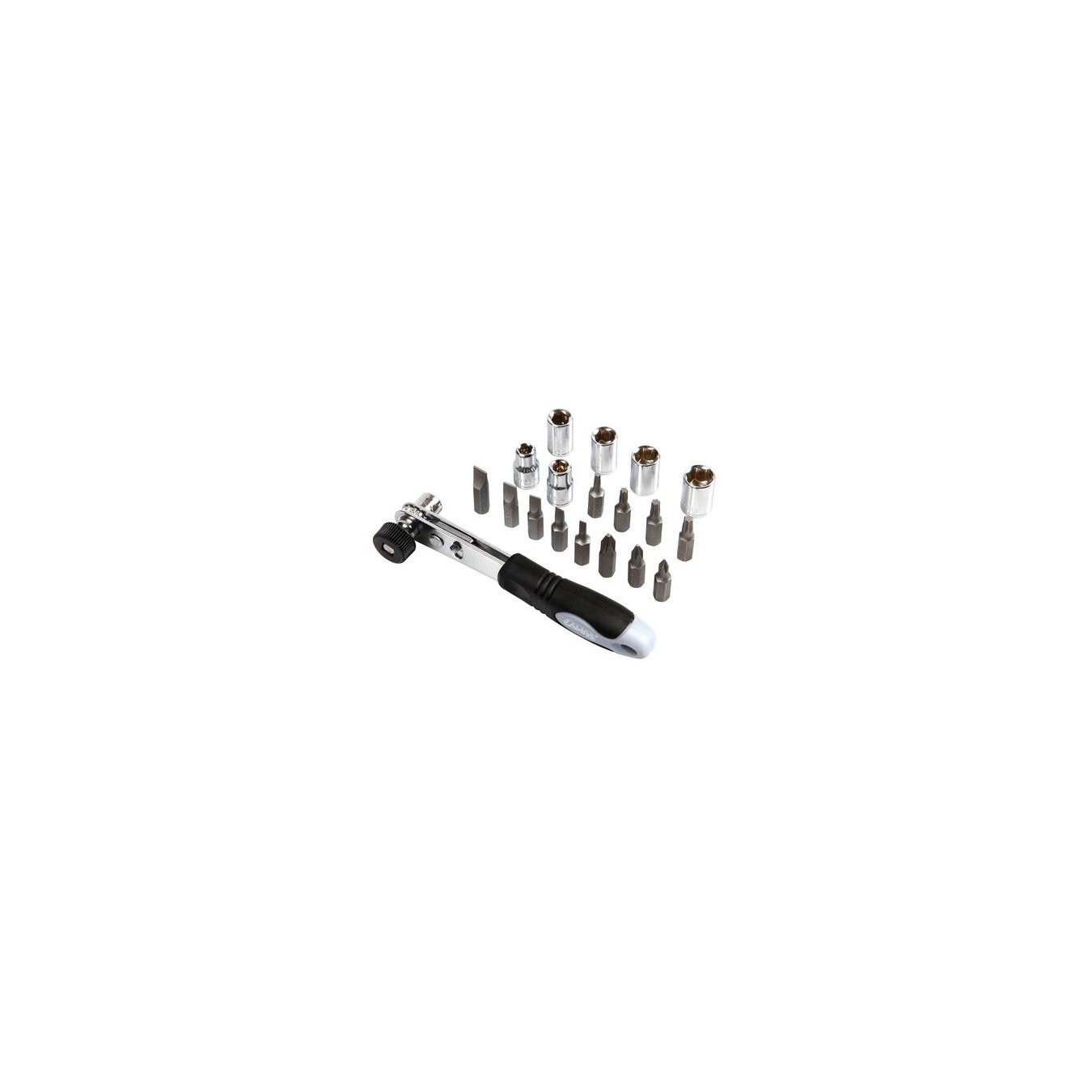 Descrizione: 1 cricchetto 6 bussole: 5, 6, 7, 8, 9, 10 mm 3 inserti croce: PH0, PH1, PH2 5 inserti taglio: SL3, SL4, SL5, SL6, SL7 4 inserti torx: T10, T15, T20, T30