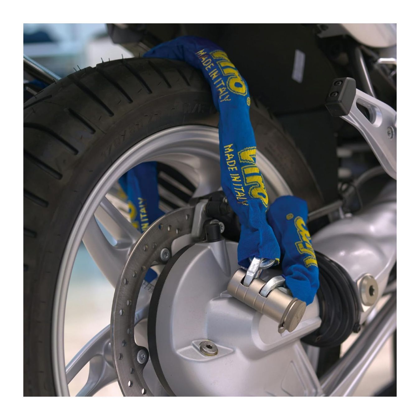 • Catena semiquadra (per contrastare le troncatrici manuali che hanno generalmente lame taglienti adatte a trattenere i profili tondi) in acciaio speciale (al manganese) cementato, temprato, rinvenuto e zincato. La catena ha sezione 10 mm. ed è ricoperta da guaina di protezione di colore blu, in tessuto che minimizza l'ingombro e antigraffio.