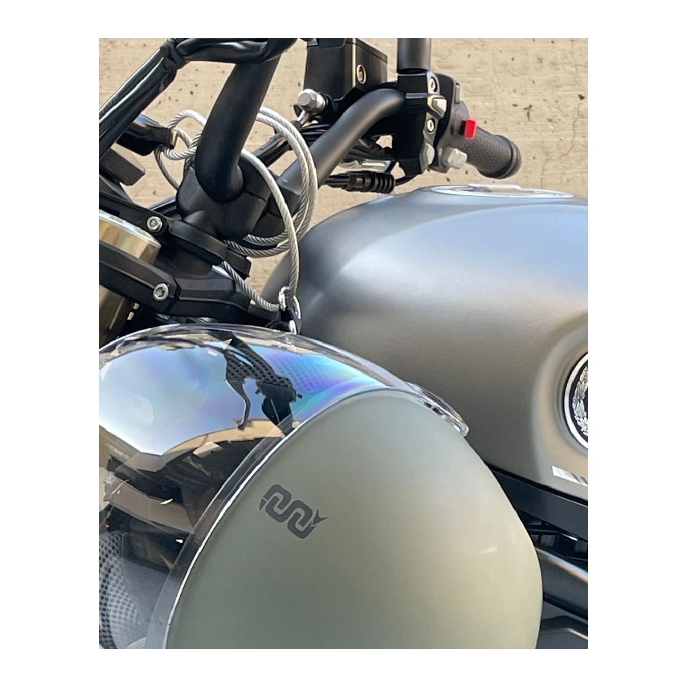 Compatibile con la maggior parte dei caschi, il cavo è facile da utilizzare e si aggancia rapidamente alla tua moto o a un supporto sicuro.