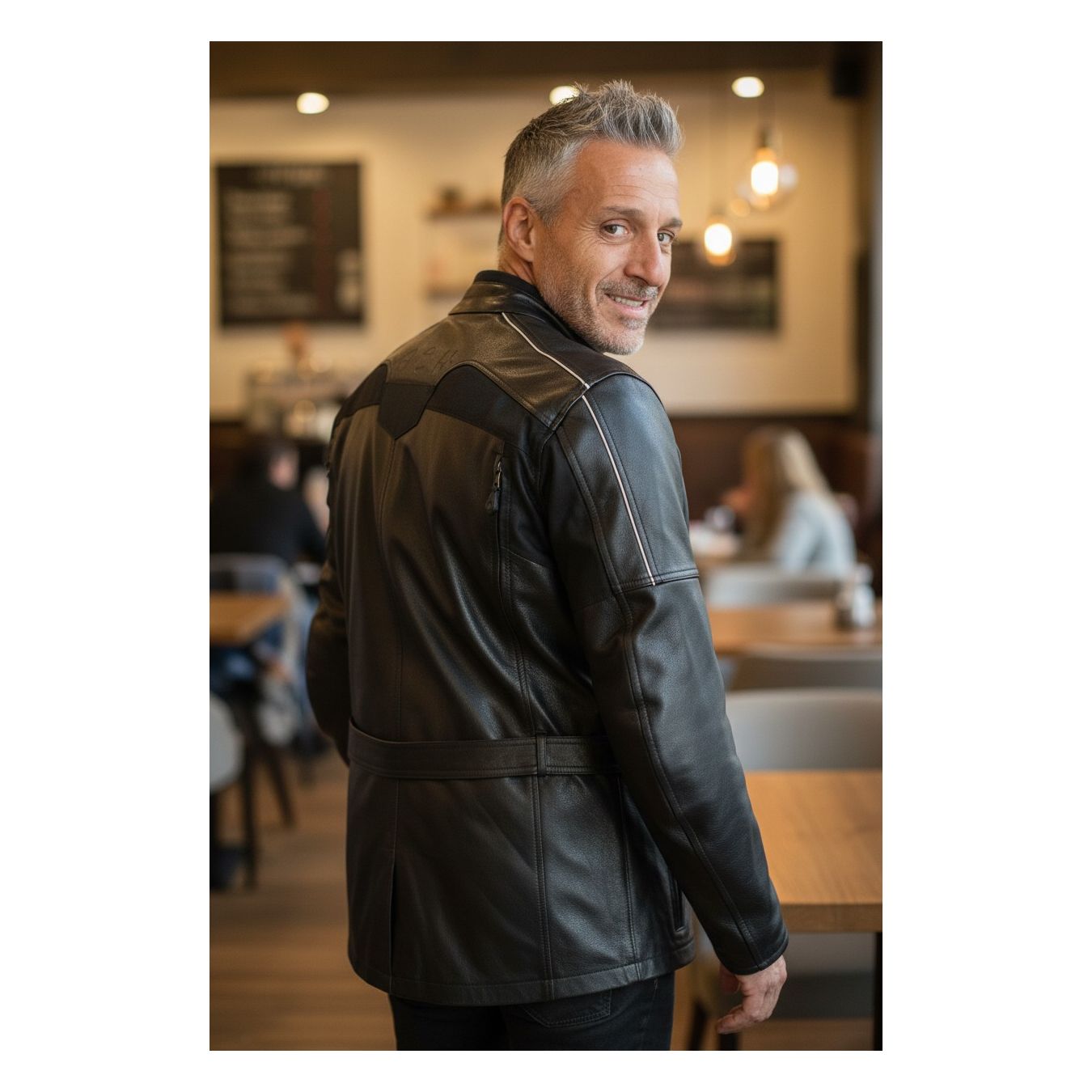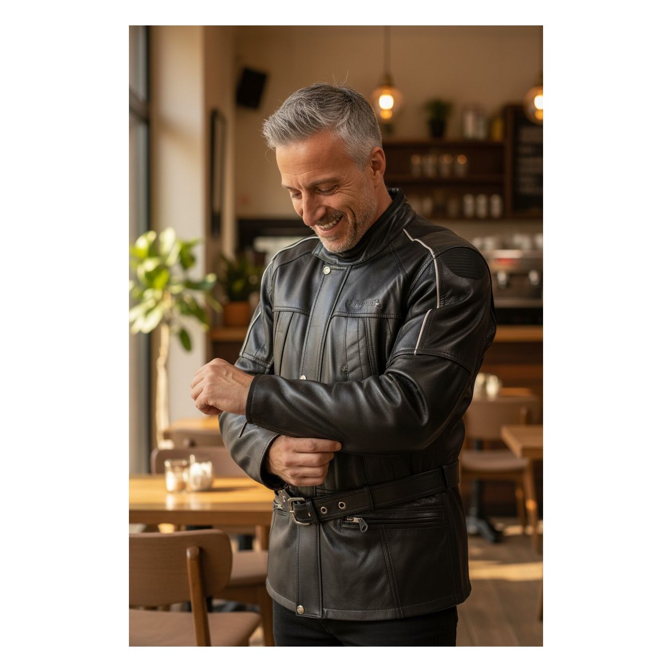 Giacca in pelle 3/4 dotata di membrana impermeabile 100% Cintura in vita, zip sui fianchi per renderla più confortevole in sella Apertura tramite zip lungo tutto il braccio e lateralmente su due lati della schiena per una maggire areazione estiva Protezioni omologate CE amovibili su spalle e gomiti Alloggio predisposto per paraschiena rigido Back Converter