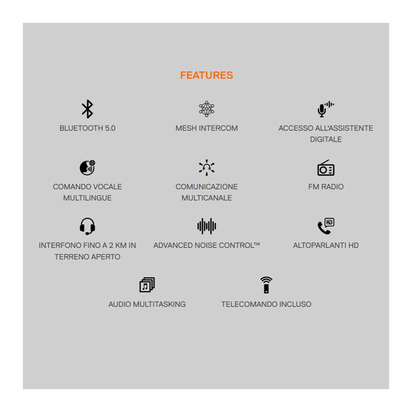 L'unità principale, perfettamente integrata sul retro del casco, include una batteria ad alte prestazioni in grado di garantire un'autonomia di conversazione fino a 12 ore. Il nuovo telecomando, posto sul lato del casco, è stato progettato ergonomicamente per garantire la massima usabilità con i guanti.