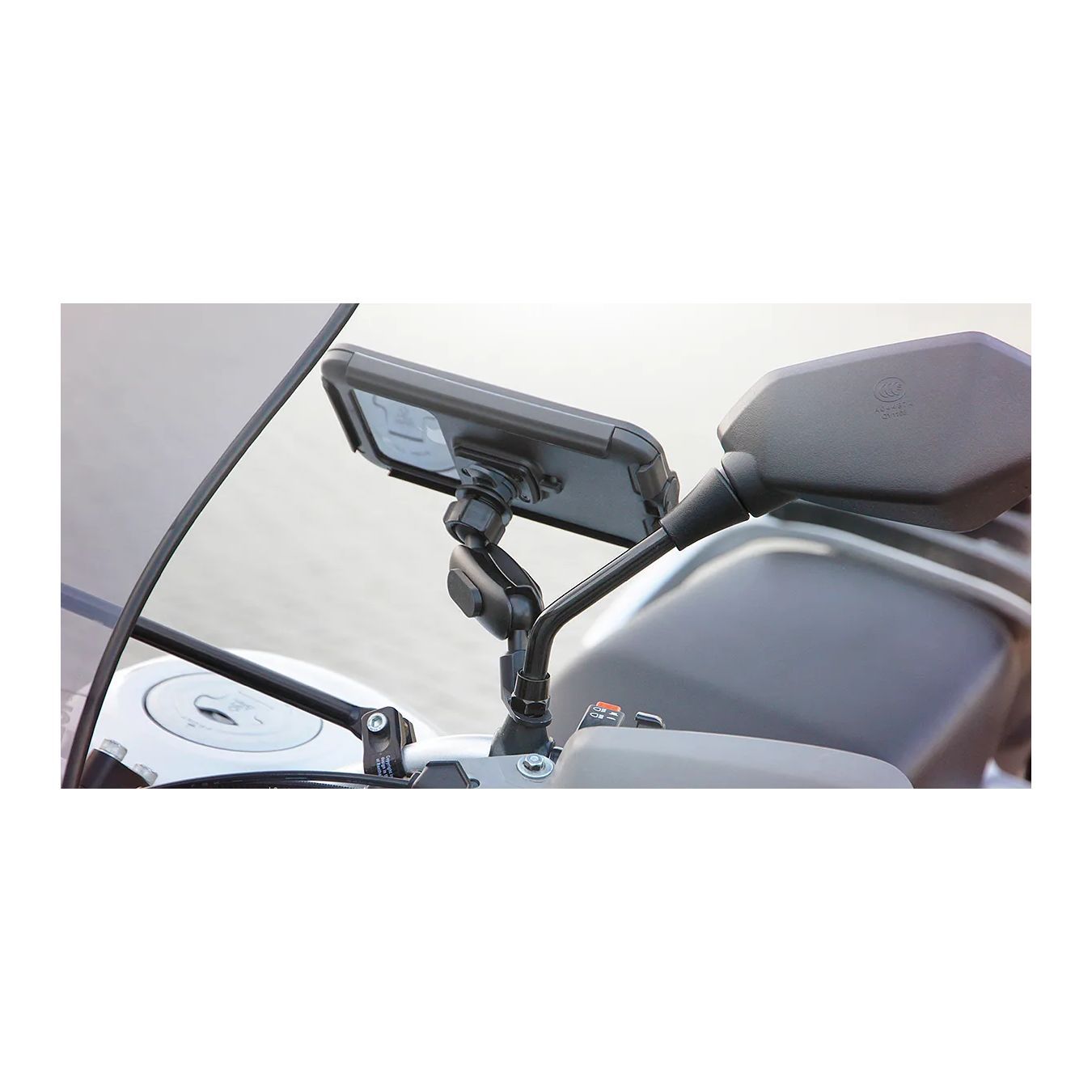 Sfrutta la base degli specchietti retrovisori come ancoraggio. Nelle moto o negli scooter con gli specchietti montati direttamente sulla carena questa tipologia di staffe non è utilizzabile.