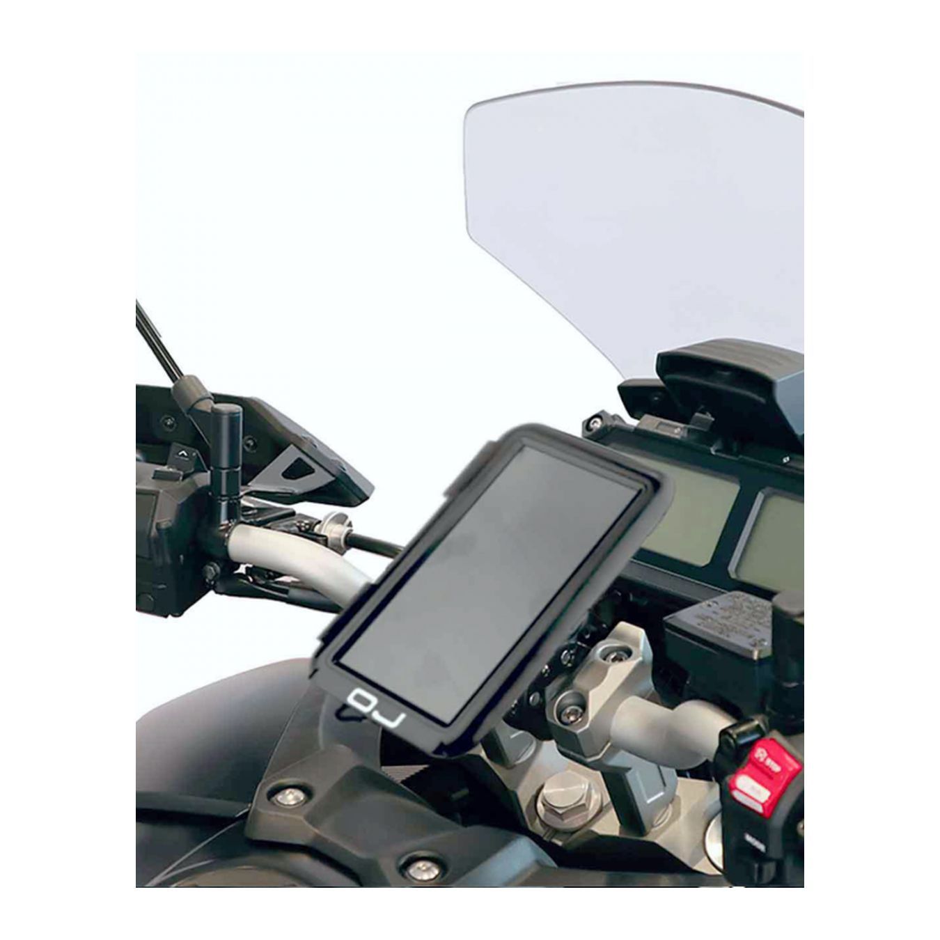 Porta smartphone da manubrio o da specchietto, facile da montare grazie al doppio supporto in dotazione: quello a morsa per il manubrio e quello a braccetto per lo specchietto.