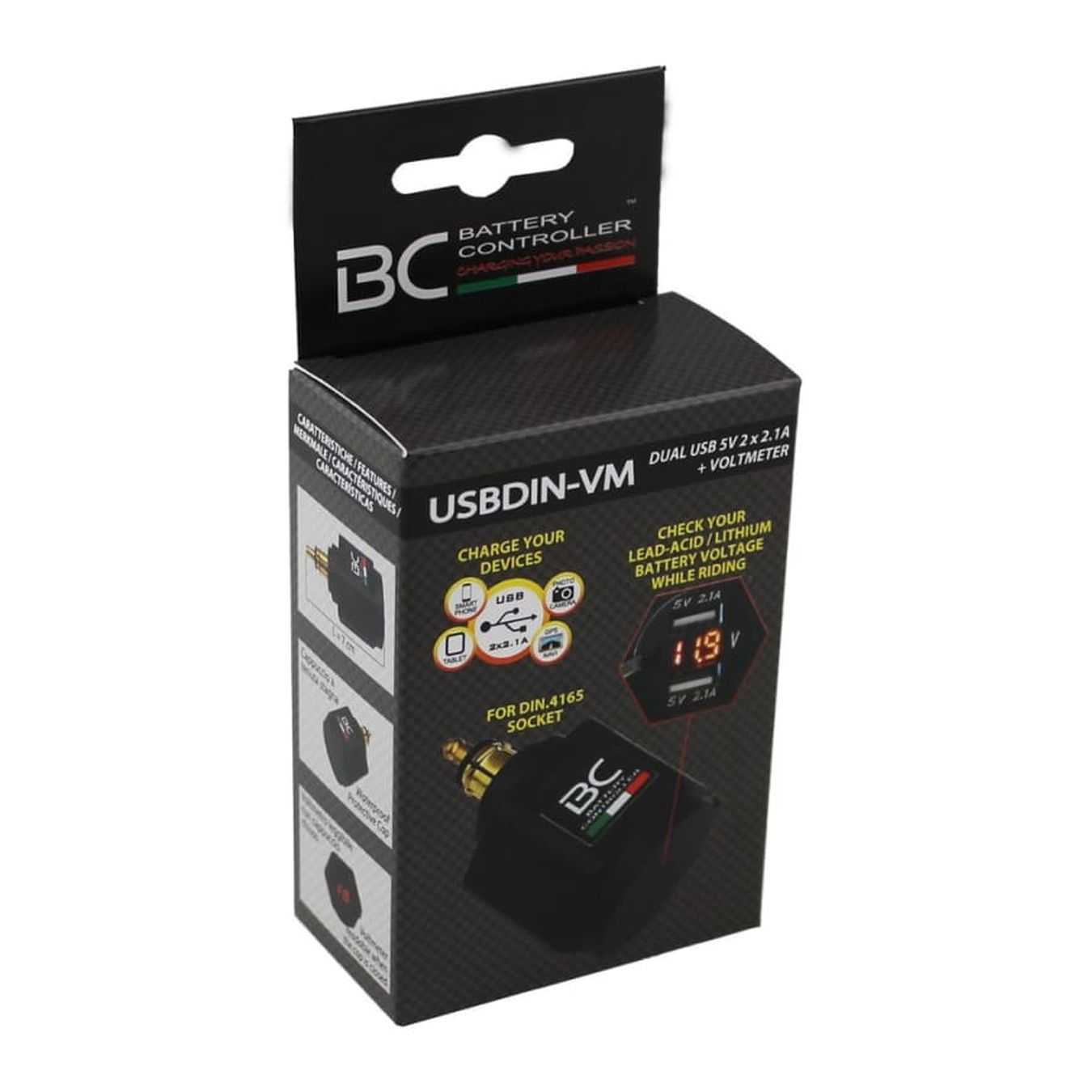 L'accessorio USBDIN-VM è un adattatore con doppia presa USB con attacco per accendisigari DIN.4165, comunemente montato su moto BMW (ad.es. GS 1200), Triumph e Ducati (vedi immagini).