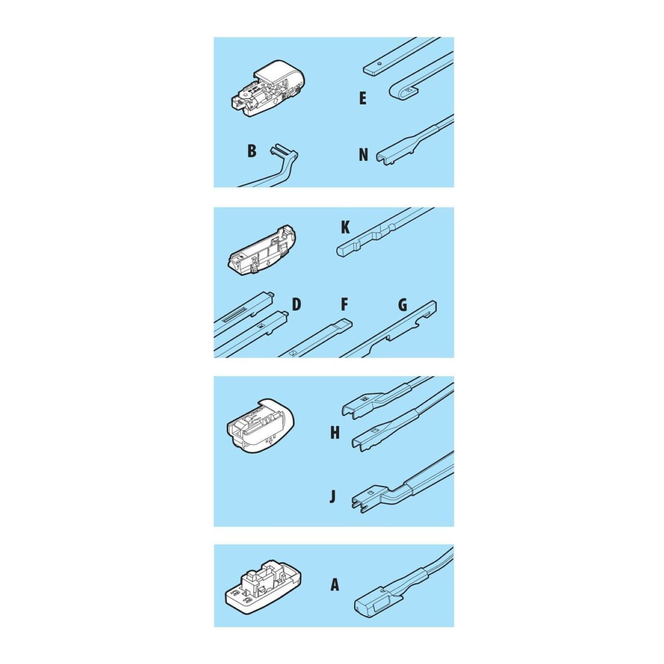 • Sistema di montaggio multiplo con raccordi in dotazione per il montaggio sulla maggior parte dei veicoli equipaggiati con tergicristalli tradizionali o con spazzole senza articolazioni.