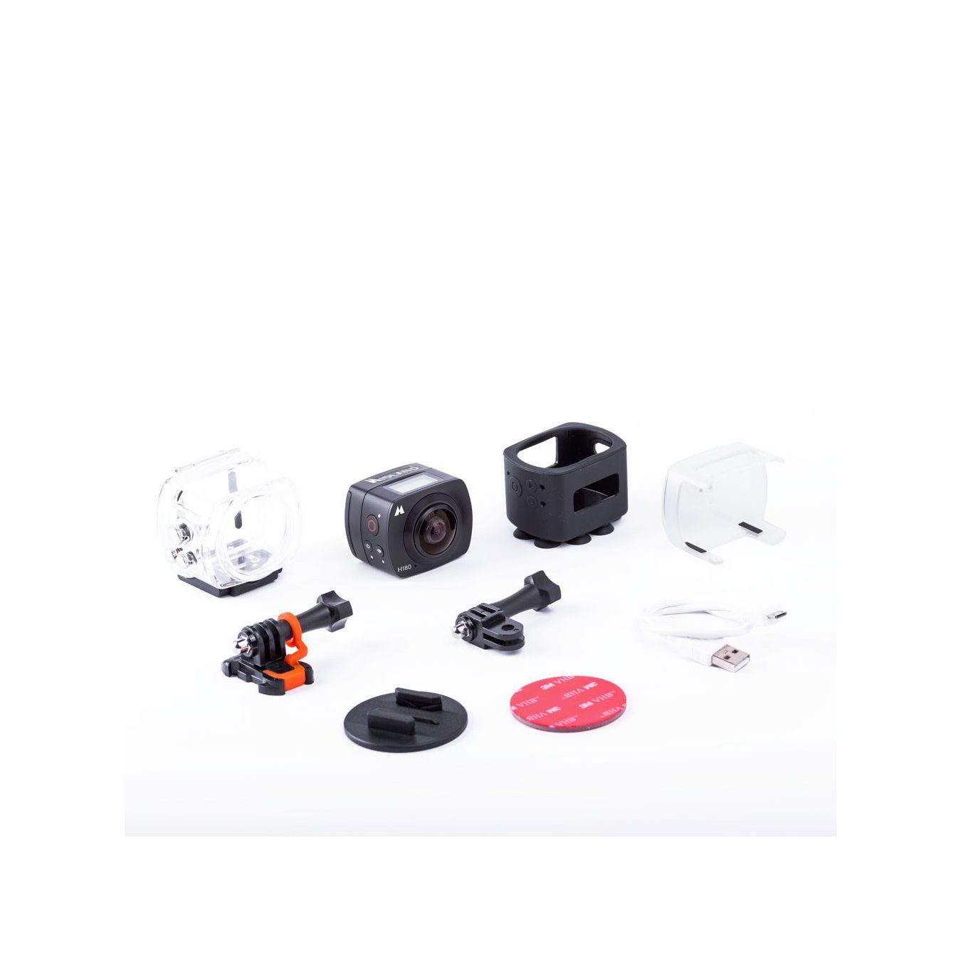 Videocamera H180, Pacco batteria Li-Ion 1000mAh, custodia waterproof 30m, telecomando Wi-Fi, cornice er aggancio Go Pro, attacco a ventosa, fissaggio adesivo, cavo USB, supporto 90°.